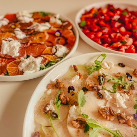 - Carpaccio van peer en meloen met rozijnen, walnoten en blauwe kaas (BRUNCH) €2,50 per persoon