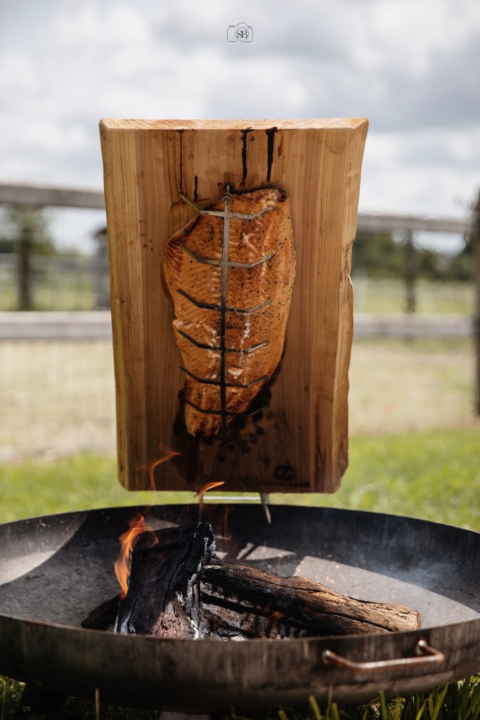 - Zalmfilet op cederhout gegaard boven op een vuurschaal