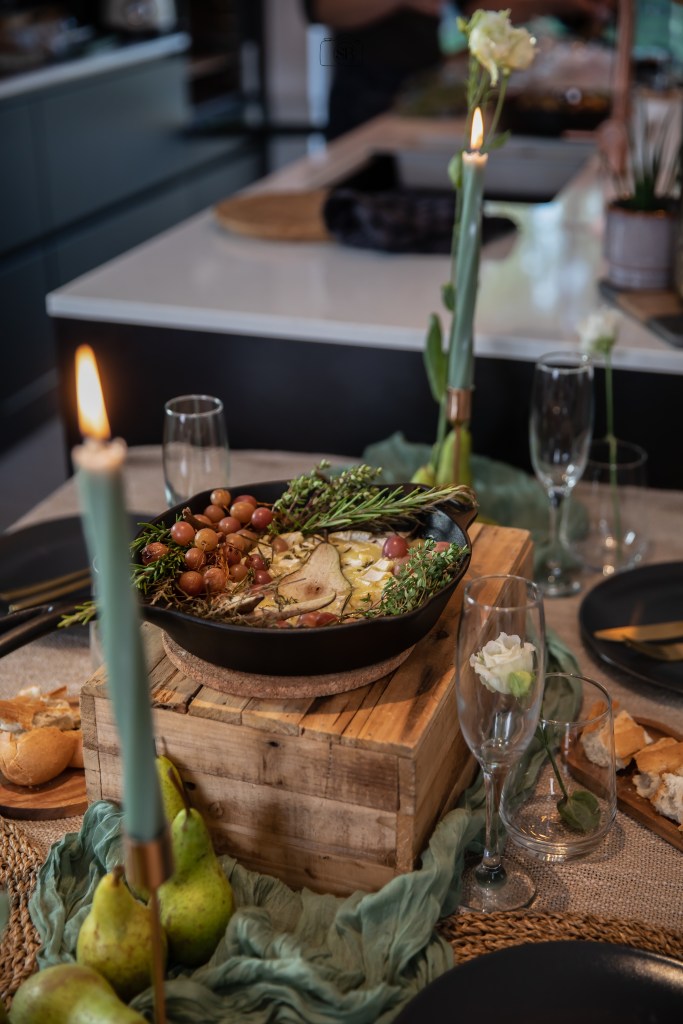 Briepannetje met druiven en peertjes voor in de oven (optie: als voorgerecht in combinatie met als aperitief een plankje met lokale charcuterie) met artisanale focaccia €27