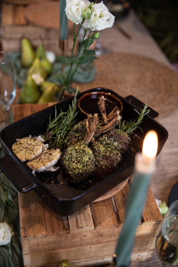 - Lamskroontje met een korst van munt, parmezaanse kaas en panko. €27 per persoon