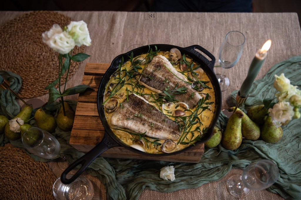 - Kabeljauwfilet met Venusschelpen- in een sausje van saffraan en zeecres €11,50 per persoon.